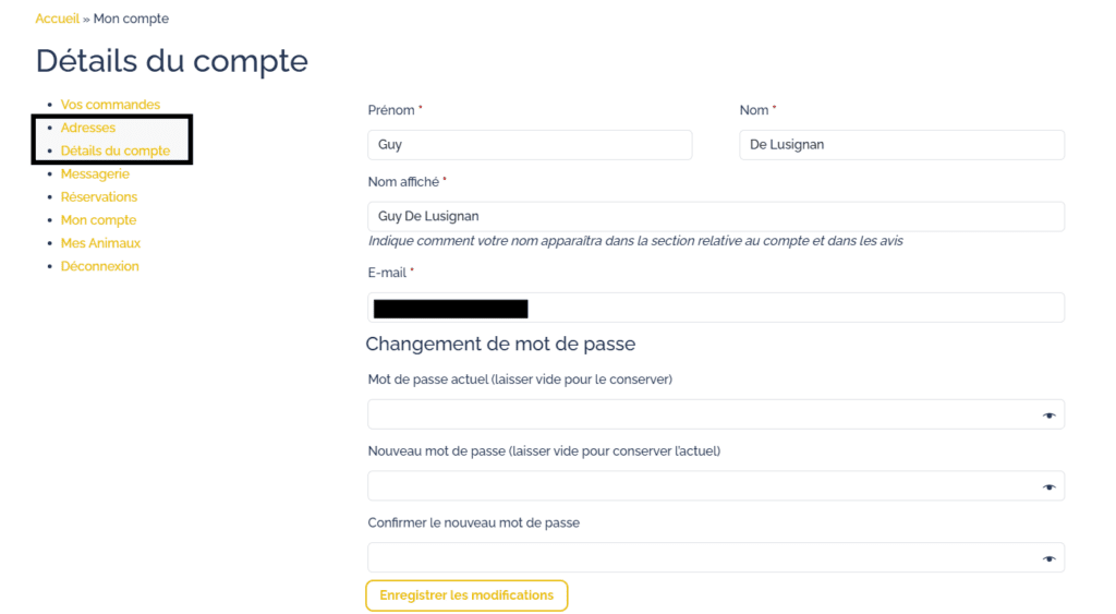 Sur votre compte, vous pouvez modifier vos informations personnelles via les onglets :